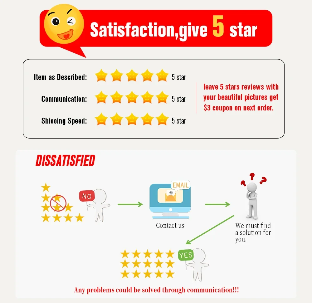 Since your feedback is very important to the development of our business, we sincerely invite you to leave positive feedback for us if you are satisfied with our product and service. It'll just take you one minute. If you aren't satisfied, please don't give us negative feedback immediately, please contact us first, no matter what happens, We believe that we can find a best way to resolve the problem. Thank you for your understanding.